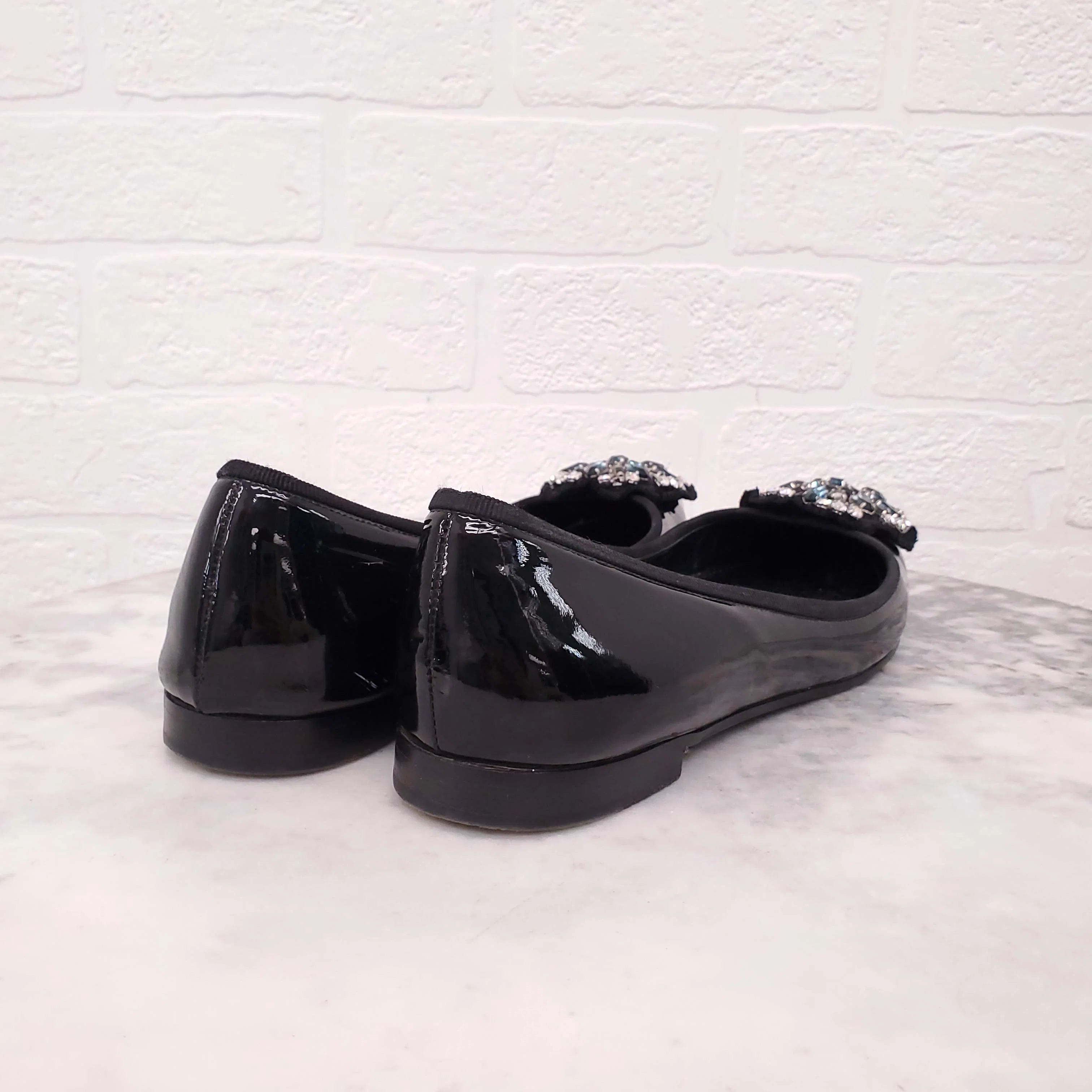PRADA BLACK PATENT FLATS WITH CRYSTAL EMBLEM - SIZE 38.5